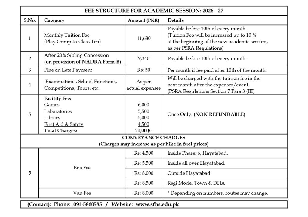 • Further details can be obtained from the secretarial staff during the working hours. The phone numbers of the school are: +92-91-5860541 , +92-91-5860542 , +92-91-5860544, +92-91-5860585